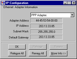 Click on More Info and make sure that your DNS Servers shows 203.13.33.1. If any of these settings are incorrect, then please double check the Configuring Dial-Up Networking section and make sure that all your TCP/IP settings are correct.